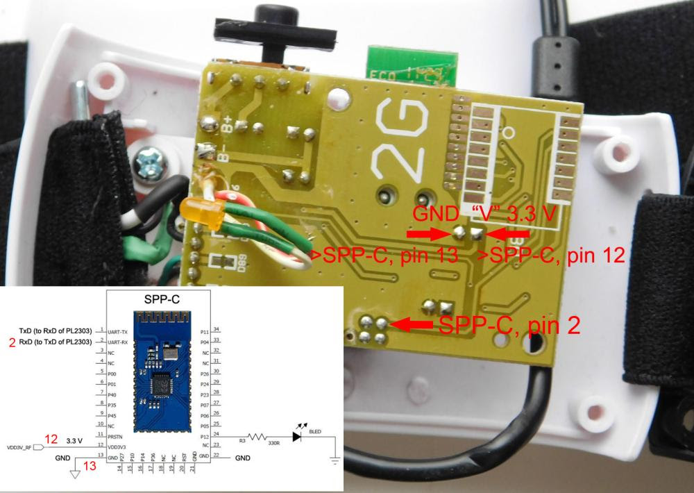 Если стоит задача минимальной переделки нейрогарнитуры только для обеспечения её совместимости с приложениями NeuroSky для Android и частично с Windows, то будет достаточно приобрести модуль Bluetooth SPP-C и подпаять 3 провода к нему. Контакт 2 модуля блютуса соединяется с контактом T (TxD) модуля TGAM, а контакты 12 и 13 модуля блютуса соединяются с контактами на основной плате так, как показано на фото ниже. Подключать питание модуля блютуса непосредственно к контактам модуля TGAM нежелательно, так как это будет создавать помехи пульсациями по цепи питания и ухудшать качество считывания ЭЭГ и соответственно снижать достоверность значений параметра «медитация».