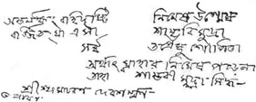 Выше приводится факсимиле и подпись Лахири Махасая на бенгали. Эти строки из письма к одному чела. Великий учитель следующим образом трактует один санскритский стих: "Кто достиг состояния покоя, когда веки у него не мигают, тот достиг самбхави мудра"21. Подпись внизу слева "Шри Шьяма Чаран Дэва Шарман".