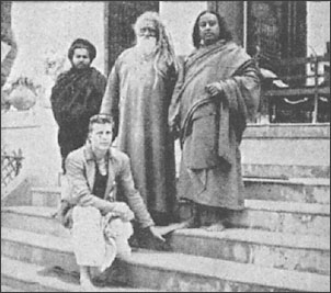 | Мистер Райт и я позируем вместе с почтенным свами Кешабанандой и учеником у величественной обители в Бриндабане |